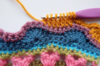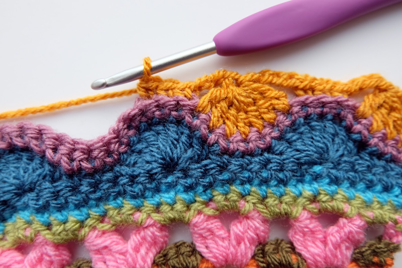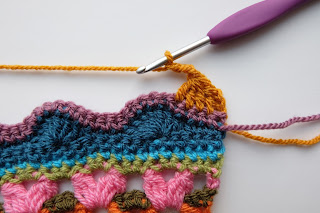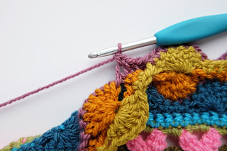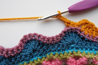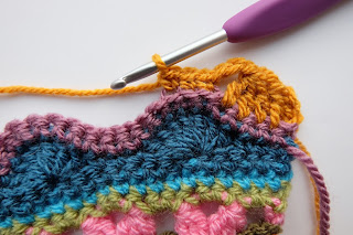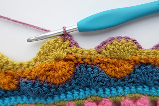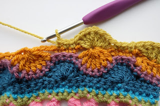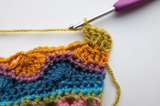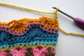next 2ch, 1dc into each next 3sts; repeat from * to end changing yarn shade to
