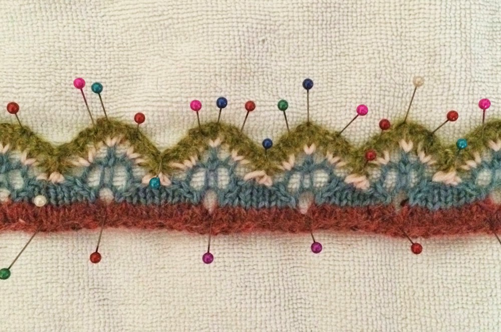 On our final day we had a lace workshop and we also made some dorset buttons which are always good fun to do. The image below shows the lace trim for the bag being blocked. I always soak my knitted pieces for a while before I put them together - soaking makes a massive difference to wool in particular and is in my view imperative to a good finish.